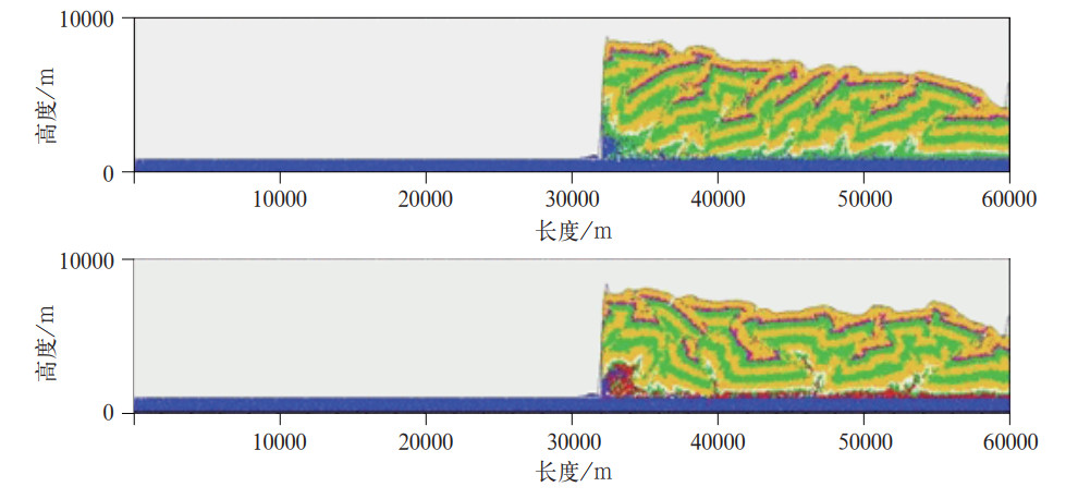 强滑脱层模型中,滑脱层的高韧性使底部滑脱剪切作用显著增强:构造变形起始阶段,深部(滑脱层附近)即出现明显构造扰动; 上覆地层虽仍发育叠瓦状逆冲构造,但逆冲席体内部变形复杂度提升,叠瓦构造的连续性弱于弱滑脱情形,且前缘变形展布范围更广泛。相较于弱滑脱模型,强滑脱层模型构造变形的层次分异性与扰动程度更为显著(图 7下)。