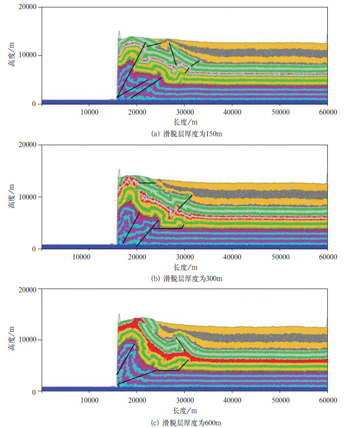 滑脱层厚度对挤压构造的演化同样具有重要影响。滑脱层厚度为150m时,能干性差异显著,滑脱层较薄且强度相对较高,表现为“褶皱主导、断层次生”的薄皮逆冲特征。前陆侧发育紧闭不对称褶皱,背斜被低角度前缘逆冲断层截切,断坡角较小(图 8a)。滑脱层厚度增加到300m时,构造样式由单排紧闭褶皱转变为隔挡式箱状背斜—向斜对,主干逆冲断层沿滑脱层内部产生多条分支,形成叠瓦扇构造(图 8b)。滑脱层厚度高达600m时,形成“滑脱层主导”的巨型褶皱—冲断系统。构造样式转变为宽缓箱状背斜与宽向斜交替,主干逆冲断层倾角进一步降低,在滑脱层内部形成多条近平行的大型拆离断层(图 8c)。此外,滑脱层厚度还影响油气封盖性能:薄层塑性滑脱体系中,断层易切穿塑性滑脱层,封盖性能被严重破坏; 厚层塑性滑脱体系中,塑性层连续完整,未被断层切穿,封盖性能优良(图 8)。