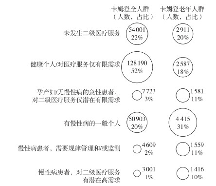 将卡姆登地区全人群和老年人群的风险分层结果进行比较发现:全人群中,第二层(健康个人/对医疗服务仅有限需求)人数最多,占52%;而老年人群多数患有慢性病,第四层(慢性病患者,对二级医疗服务有潜在高需求)人数最多,占31%。老年人群的医疗需求明显高于全人群[29]。见图 1。