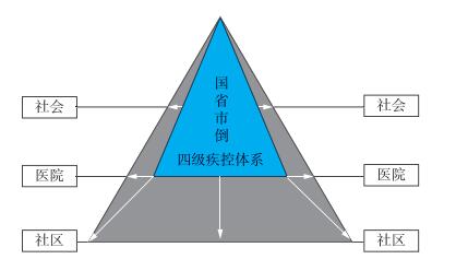 5.2 巩固已有的四级疾病预防控制体系,并把体系拓展到医院、社区和社会医防结合,省、市两级疾病预防控制中心要有医疗业务支撑,或直接办医院,或打通疾病预防控制机构的人员在医院兼职行医的渠道。对接社区,县级疾病预防控制中心要拓展健康管理业务,其公共卫生执业医师可在社区卫生服务中心执业,并拥有一定疾病诊疗范围内的处方权,比如说高血压、糖尿病。对接社会,要通过政府购买服务、中心负责经办的方式,将各类社会力量纳入到疾病预防控制网络中来。见图 1。