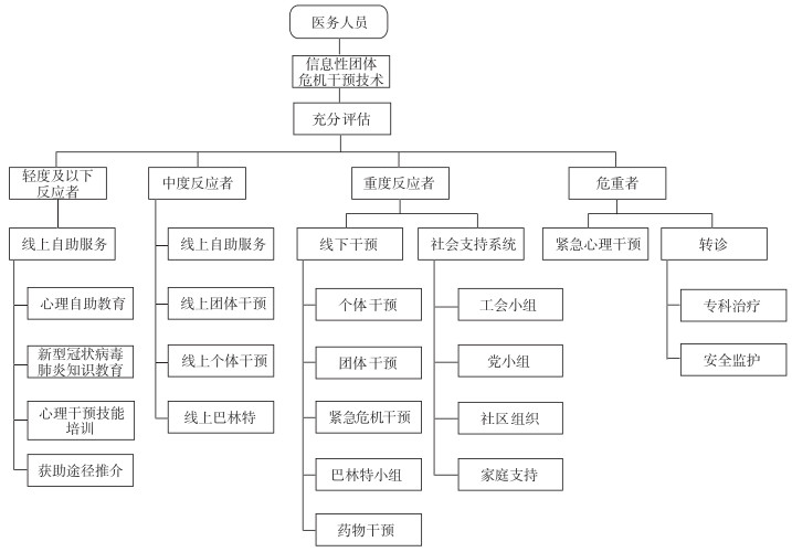 轻度及以下反应者:心态较平稳,焦虑、抑郁等症状为轻度或无;PHQ-9不超过9分,GAD-7不超过9分,PPS-10不超过13分。中度反应者:有一定的失眠、焦虑、抑郁等症状,医务人员尚能坚持上班;PHQ-9为10~19分,GAD-7为10~14分,PPS-10为14~19分。重度反应者:心态失衡,有明显的焦虑、抑郁及失眠、纳差症状,医务人员难以坚持上班;PHQ-9为20分及以上,GAD-7为15分及以上,PPS-10为20分及以上。危重者:除上述症状外,出现明显的自杀意念、冲动伤害行为或精神病性症状。