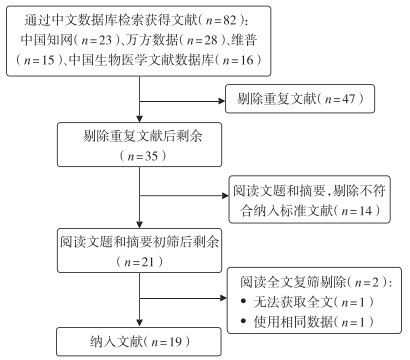 2 结果 2.1 文献检索结果在中文数据库初步检索到文献82篇,剔除重复文献后剩余35篇,经阅读文题和摘要初筛后剩余21篇,进一步阅读全文复筛,排除无法获取全文的文献1篇和使用相同数据分析的文献1篇,最终纳入Meta分析19篇。文献检索和筛选流程见图 1。
