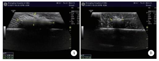 | A,long and short diameters of gasification volumes following radiofrequency ablation at 45 W for 60 s in muscle;B,maximum diameter of gasification volume following ablation at 45 W for 60 s in muscle. 图 1 RFA的超声图像 Fig.1 Ultrasound images following RFA |