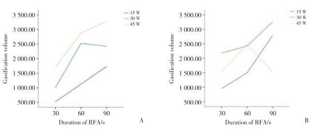 | A, differences in gasification volumes in muscle; B, differences in gasification volumes in liver. 图 2 RFA后随时间和功率的改变超声下气化范围的变化 Fig.2 Differences in gasification volumes following RFA according to differences in duration and power |