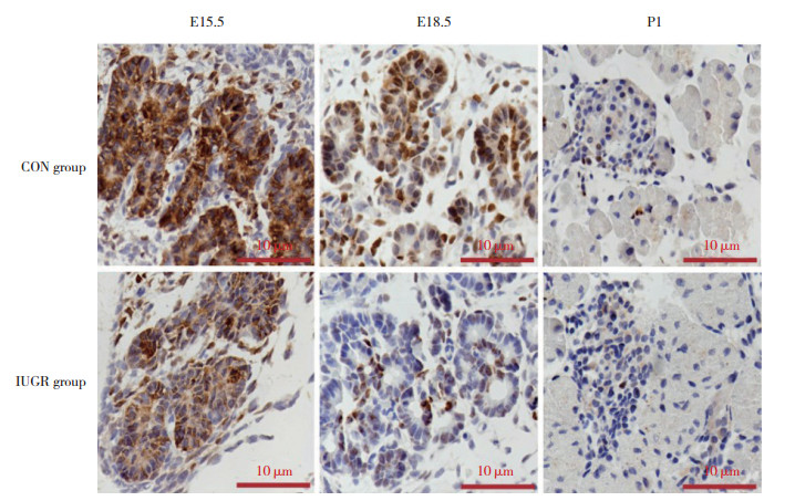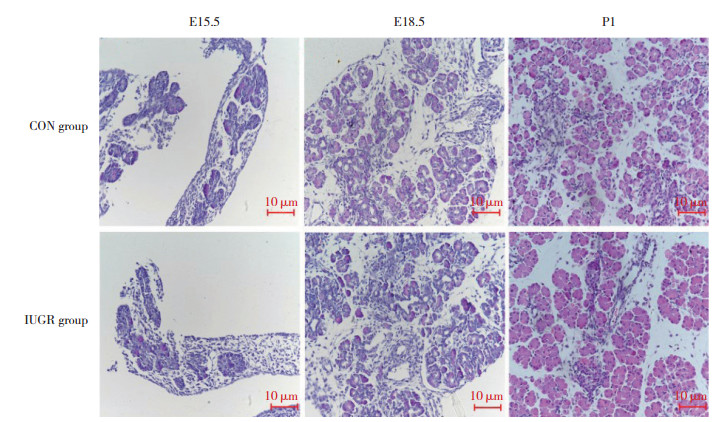 结果显示,CON组E15.5时,胰腺腺泡、导管结构已出现,腺泡、导管数量较多、体积稍大,排列密集;E18.5时,胎鼠β细胞开始聚集,胰岛结构初步形成;P1时可见胰腺内外分泌部的典型结构已形成,胰岛数量较多,面积较大,胰岛结构饱满、清晰。IUGR组与CON组比较,E15.5时腺泡导管结构体积小、数量少,排列较松散,E18.5时组织弥散,P1时则胰岛数量及面积减少,分布相对不规则、散乱。见图 1。