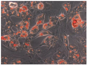 | 图 1 ADSCs成脂诱导后脂滴形成×400 Fig.1 Lipid induced lipid droplets formation in ADSCs ×400 |