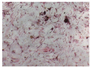 | 图 2 ADSCs成骨诱导后钙盐沉积形成×100 Fig.2 ADSCs induced calcium salt formation after osteogenesis ×100 |