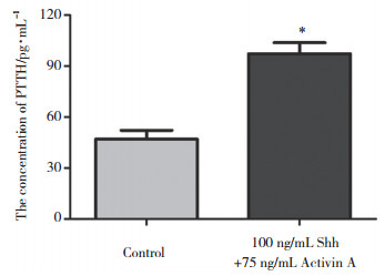| * P < 0.05 vs control group. 图 3 Shh和Activin A处理ADSCs 21 d后PTH含量的变化 Fig.3 Changes of PTH content after treatment of ADSCs for 21 d at different concentrations of Shh and Activin A |