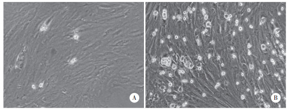 | A,control;B,100 ng/mL Shh+75 ng/mL Activin A. 图 4 Shh和Activin A处理ADSCs 21d后细胞形态变化×200 Fig.4 Morphological changes of cells after treatment of ADSCs for 21 d with Shh and Activin A ×200 |
