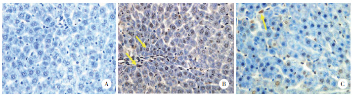 | A, sham group; B, burn group; C, stem cells group. 图 1 3组大鼠肝脏组织中人脐带干细胞的分布情况 ×400 Fig.1 The distribution patterns of human umbilical cord stem cells in hepatic tissue from the three groups of rats ×400 |
