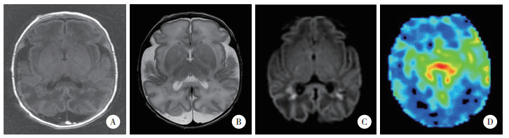 应用3.0 T MR扫描仪(Discovery MR750,美国GE Healthcare公司)和8通道专用头部线圈对新生儿行头颅MRI扫描,检查前30 min给与患儿苯巴比妥钠(10 mg/kg)镇静。检查序列包括横断位T1WI,T2WI,T2 FLAIR,矢状位T2WI,DWI及ASL磁共振灌注成像。ASL磁共振灌注成像采用三维脉冲式ASL (pulsed arterial spin labeling,PASL),扫描参数为TR 4 389 ms,TE 10.5 ms,层厚4 mm,激励3次。