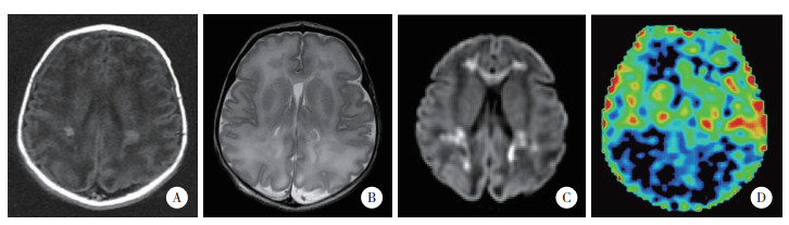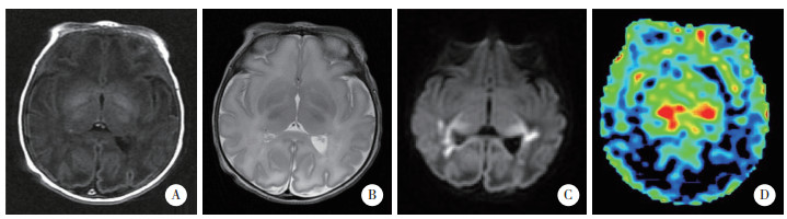 | A~C,常规MRI,双侧侧脑室旁及胼胝体区可见多发斑片状短T1短T2信号影,弥散加权呈高信号;D,ASL,脑灰质区及白质区灌注信号强度增高. 图 3 重度组典型病例MRI及ASL图像 |