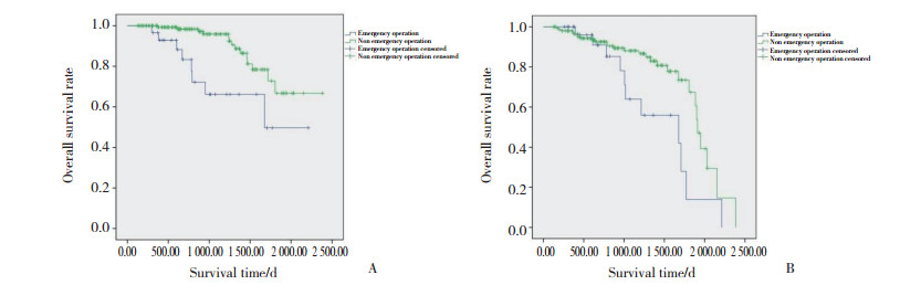 | A, survivorship curve; B, recurrence curve. 图 1 急诊手术组与非急诊手术组的生存曲线与复发曲线 Fig.1 Survival curve and recurrence curve of emergency operation group and non-emergency operation group |