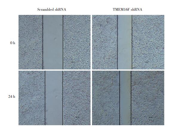 2.4 敲除T47D乳腺癌细胞TMEM16F后对细胞迁移能力的影响结果显示,转染TMEM16F shRNA后,T47D细胞的迁移能力增强,见图 3。与对照组[scrambled shRNA组,(31.45±0.94)%]比较,敲除T47D细胞中TMEM16F后的细胞迁移率[(46.74±0.42)%]增高,差异有统计学意义(t = 19.17,P = 0.002 7)。