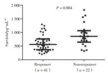 2.2 TNF-α抑制剂治疗临床应答和无应答RA患者基线期血清生存素表达水平如图 1所示,经24周TNF-α抑制剂治疗后,参考欧洲抗风湿病联盟标准对63例患者进行评估,41例符合临床应答标准(设为应答组),22例未达到临床应答(设为无应答组)。应答组基线期生存素表达水平低于无应答组(P = 0.004)。