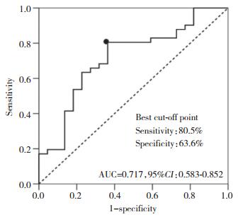如图 2所示,生存素表达水平对预测TNF-α抑制剂治疗有无应答具有较高价值,生存素表达水平越高,则预示治疗应答可能性越大,其曲线下面积(area under the curve,AUC)为0.717,95%CI:0.583~0.852,当取最佳分割点生存素水平为780.7 pg·mL-1时(特异度与灵敏度之和最大的点),特异度为63.6%,灵敏度为80.5%。