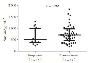 经TNF-α抑制剂治疗24周后,DAS28评分结果显示16例RA患者达到临床缓解(设为缓解组),47例未达到临床缓解(设为未缓解组),缓解组基线期生存素水平与未缓解组相比无统计学差异(P = 0.265)。见图 3。
