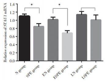 SPE组胎盘组织中STAU1 mRNA的表达水平(0.844±0.074)显著低于N组(1.096±0.057),差异有统计学意义(P < 0.01);其中,ESPE组胎盘组织中STAU1 mRNA的表达水平(0.683±0.061)显著低于EN组(1.015±0.060),差异有统计学意义(P < 0.01),而LSPE组胎盘组织STAU1 mRNA表达水平(1.005±0.124)与LN组(1.136±0.080)比较无统计学差异(P>0.05),见图 1。