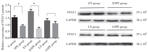 SPE组胎盘组织中STAU1蛋白的表达水平(0.916±0.102)显著低于N组(1.573±0.135),差异有统计学意义(P < 0.001);其中,ESPE组胎盘组织中STAU1蛋白表达水平(0.719±0.101)显著低于EN组(2.025±0.155),差异有统计学意义(P < 0.001),而LSPE组胎盘组织STAU1蛋白表达水平(1.112±0.165)与LN组(1.337±0.165)比较无统计学差异(P>0.05),见图 2。