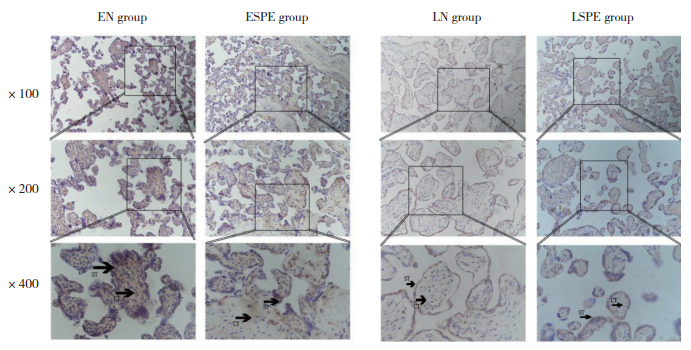 1 材料与方法 1.1 研究对象和分组选取2016年5月至2018年4月在中国医科大学附属盛京医院住院剖宫产分娩的SPE孕妇30例作为SPE组,并将其进一步分为ESPE组(15例)和LSPE组(15例);另选同期剖宫产分娩的正常妊娠孕妇30例作为对照组(N组),其中,孕周与ESPE组相对应者(EN组)10例,孕周与LSPE组相对应者(LN组)20例。SPE组和N组孕妇均为单胎、剖宫产分娩,排除生殖器官畸形、多胎及其他妊娠相关合并症(如妊娠期糖尿病、原发性高血压、慢性肾炎等),其中,EN组常由宫颈机能不全、胎膜早破、前置胎盘、孕妇合并严重先天性疾病等病因而终止妊娠。