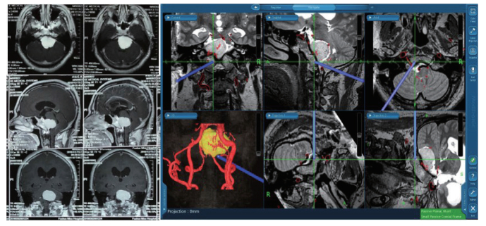 | 图 1 根据患者术前MRI影像资料进行多模态神经导航系统图像融合及三维重建模型,指示病变及其与周围重要组织结构间的空间关系,术中实时引导显微手术 Fig.1 Image fusion and 3D reconstruction model of multimodal neuronavigation system based on preoperative MRI image data of patients, indicatived lesion and its spatial relationship with the surrounding important tissue structure, real-time guided microsurgery during operation |