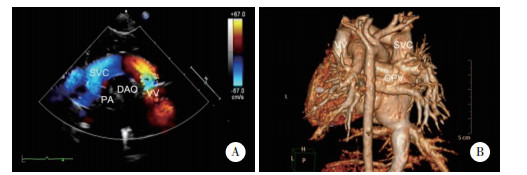 A,彩色多普勒显示垂直静脉向上走行汇入上腔静脉并最终入右心房;B,CTA重建图像,肺静脉干经垂直静脉异位引流入上腔静脉. DAO,降主动脉;PA,肺动脉;VV,垂直静脉;SVC,上腔静脉. 图 4 心上型TAPVC |