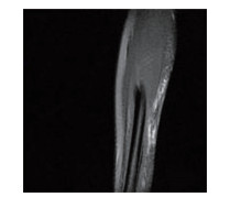 1 临床资料患者,女,16岁,于2016年8月以“左前臂尺侧肿物4年,疼痛加重1年”为主诉入院。查体可见左前臂尺侧约3 cm×3 cm包块,表面光滑,无压痛、破溃及流液,无皮温、皮色异常,否认外伤史。超声检查显示不均质低回声,范围约3.06 cm×0.54 cm,中心部见条状强回声,血流不丰富,考虑脂肪瘤伴钙化或不典型血管病变伴静脉石(图 1);增强MR显示梭形长T2信号,压脂信号减低,明显强化,考虑肌间血管源性肿瘤(图 2);血液生化检查可见白细胞11.61×109/L,血红蛋白152 g/L,其他指标无明显异常。肿物切除术中可见深筋膜周围钙化样组织,病理检查显示梭形细胞增生,核卵圆形,可见小核仁(图 3)。免疫组化显示CK(+)、CD34(+)、Vimentin(+)、S-100(-)、Desmin(-),符合ES诊断。