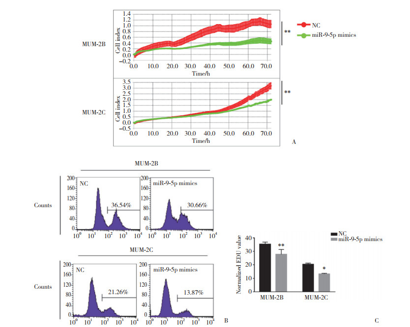 2 结果 2.1 miR-9-5p抑制脉络膜黑色素瘤细胞的增殖利用RTCA细胞实时增殖实验观察各组细胞的增殖情况,与NC组相比,MUM-2B (t = 6.925)和MUM-2C (t = 4.762)细胞转染miR-9-5p mimics后,细胞增殖能力明显下降(P < 0.01),见图 1A。用EDU细胞增殖实验进一步验证miR-9-5p对细胞增殖的影响,结果表明,MUM-2B (t = 4.779)和MUM-2C (t = 4.514)细胞转染miR-9-5p mimics后,细胞的增殖能力明显减弱(P < 0.05),见图 1B、1C。提示miR-9-5p能够抑制脉络膜黑色素瘤细胞的增殖。