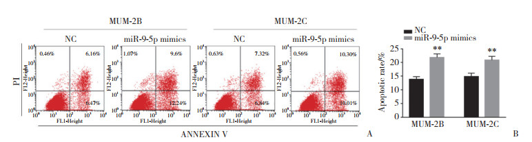 采用流式细胞仪检测各组脉络膜黑色素瘤细胞的凋亡变化情况。如图 2所示,与NC组相比,MUM-2B (t = 7.385)和MUM-2C (t = 4.893)细胞转染miR-9-5p mimics后凋亡率明显增加,差异有统计学意义(P < 0.001),见图 2A、2B。脉络膜黑色素瘤细胞的凋亡水平与miR-9-5p的表达量呈正相关,表明miR-9-5p能够促进脉络膜黑色素瘤细胞的凋亡。