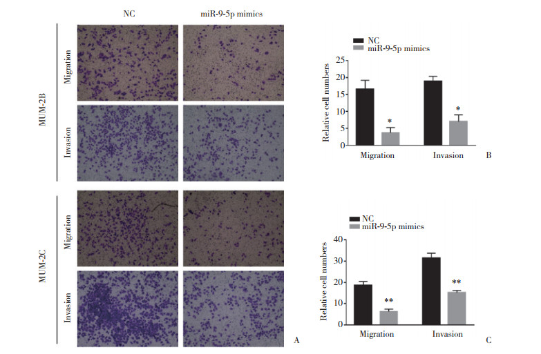 Transwell迁移和侵袭实验结果显示,与NC组相比,MUM-2B (t = 7.223)及MUM-2C (t = 11.03)转染miR-9-5p mimics后,迁移细胞量均显著减少(P < 0.05);与NC组相比,MUM-2B (t = 8.271)及MUM-2C (t = 11.42)转染miR-9-5p mimics后,侵袭细胞量均显著减少(P < 0.05),见图 3。提示miR-9-5p亦能抑制脉络膜黑色素瘤细胞的迁移和侵袭。