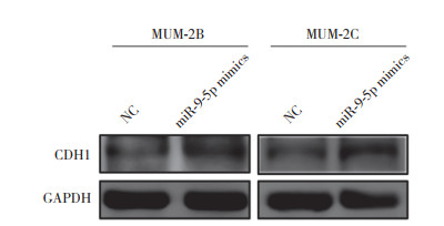 2.5 验证CDH1是miR-9-5p的靶基因为验证CDH1,CTNNA1,ITGA6是否为miR-9-5p的靶基因,随机选择性地对CDH1进行实验验证。给予MUM-2B和MUM-2C细胞转染miR-9-5p mimics后,以Western blotting检测不同分组的CDH1蛋白表达变化情况。如图 4所示,与NC组相比,转染miR-9-5p mimics组MUM-2B和MUM-2C细胞CDH1的表达均下调。
