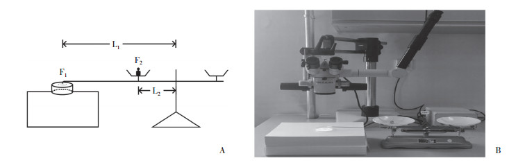 1.2.2 制作实验装置取一托盘天平置于水平桌面,并将一延长杆固定于托盘天平左侧横梁上,使延长杆与横梁位于同一直线,刻度尺测得延长杆末端距天平中点距离(L1)约为30 cm,测得托盘着力点距天平中点距离(L2)约为10 cm,在显微镜下,观察延长杆末端对IOL作用情况。见图 1。