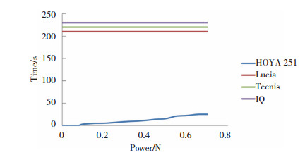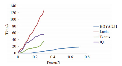 | 图 2 不加入粘弹剂时各IOL黏附分离时间与力的关系 Fig.2 Relationship between adhesion time and force of each IOL without viscoelastic agent |