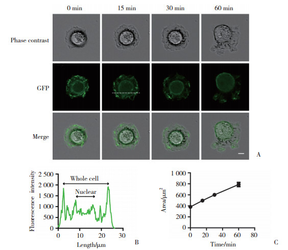为了分析Lifeact-pEGFP是否可以用来检测肌动蛋白的动态变化,将转染Lifeact-pEGFP质粒的BMEC消化后重新接种于培养皿中,置于37 ℃的培养条件下继续培养,此时可以观察到细胞从悬浮至贴壁的整个过程,即细胞伸展,同时利用激光共聚焦显微镜对活细胞和GFP荧光信号进行连续观察。结果发现,在细胞逐渐伸展的过程中,肌动蛋白丝主要分布于细胞边缘,对荧光信号的分布进行分析发现,Lifeact-pEGFP主要分布于细胞外周皮质区(图 4A、4B)。BMEC伸展时,在细胞外周皮质区形成片状伪足和丝状伪足的结构,且片状伪足和丝状伪足内的Lifeact-pEGFP标记的肌动蛋白丝并不是恒定不变,而是呈现出高度动态的变化(图 4A)。在细胞伸展早期,肌动蛋白丝均匀分布于细胞皮质区并参与形成较多丝状伪足;在细胞伸展的晚期,随着细胞面积逐渐增大,肌动蛋白丝的分布出现极性分布,细胞形态也由圆形逐渐转变为扇形或梭形。细胞面积的测量结果显示,随着时间的进展,BMEC的面积逐渐增大,在60 min内呈线性增长趋势(图 4C)。以上结果表明,转染Lifeact-pEGFP可以用来分析细胞伸展时肌动蛋白丝的动态变化。