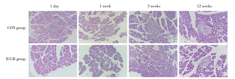 | 图 1 CON组和IUGR组胰腺组织HE染色结果×400 Fig.1 HE staining of rats pancreas in CON and IUGR groups ×400 |
