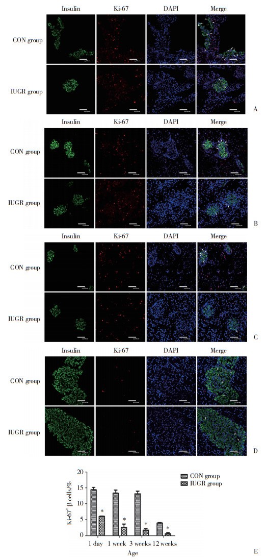 进一步通过免疫荧光双染的方法测定子鼠胰岛β细胞增殖情况,其中Ki-67和insulin共表达的部分即提示胰岛β细胞增殖。结果表明,在生后1 d及1、3、12周时,IUGR组胰岛β细胞增殖水平明显低于CON组(P < 0.01)。见图 2。