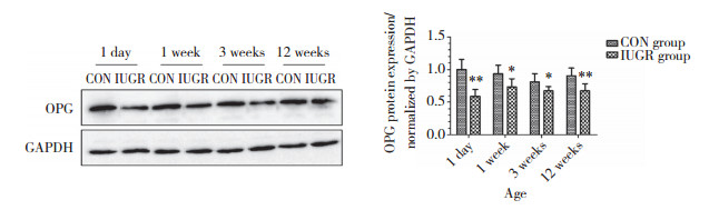 Western blotting和实时PCR结果显示,生后1 d及1、3、12周时,IUGR组OPG蛋白及mRNA的表达水平均低于CON组,其中生后1 d及12周的差异尤为显著(P < 0.01)。见图 3、4。