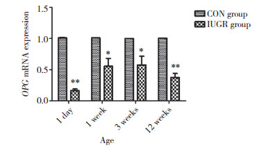 | *P < 0.05, **P < 0.01 vs CON group. 图 4 CON组和IUGR组大鼠胰腺组织OPG mRNA表达(n = 5) Fig.4 OPG mRNA expression in pancreas of rats in CON and IUGR groups(n = 5) |