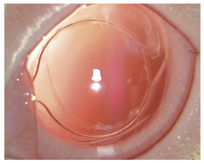 | 图 1 A组术后7 d裂隙灯检查未见后囊膜混浊×16 Fig.1 No posterior capsular opacity observed by slit lamp inspection in group A at 7 days after surgery × 16 |