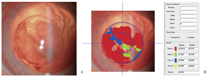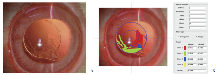 | 图 2 A组术后28 d裂隙灯检查晶状体后囊膜图像(A)及对应PCO-CAAS图像定量分析系统后囊膜混浊评分(B) × 16 Fig.2 Posterior capsular image (A) observed by slit lamp inspection and corresponding posterior capsular opacity score measured by PCO-CAAS (B) in group A at 28 days after surgery × 16 |