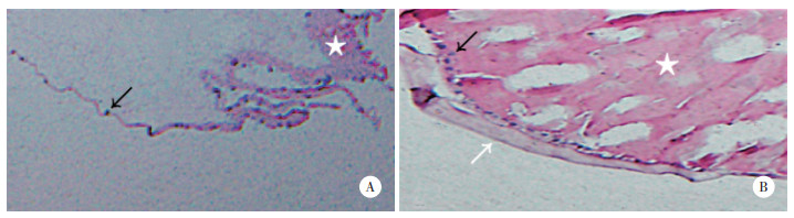 | A, group A; B, group B. Black arrow, lens epithelial cells; white arrow, posterior capsule; white star, extracellular matrix. 图 5 HE染色检查结果× 100 Fig.5 The hematocellin-eosin staining results × 100 |