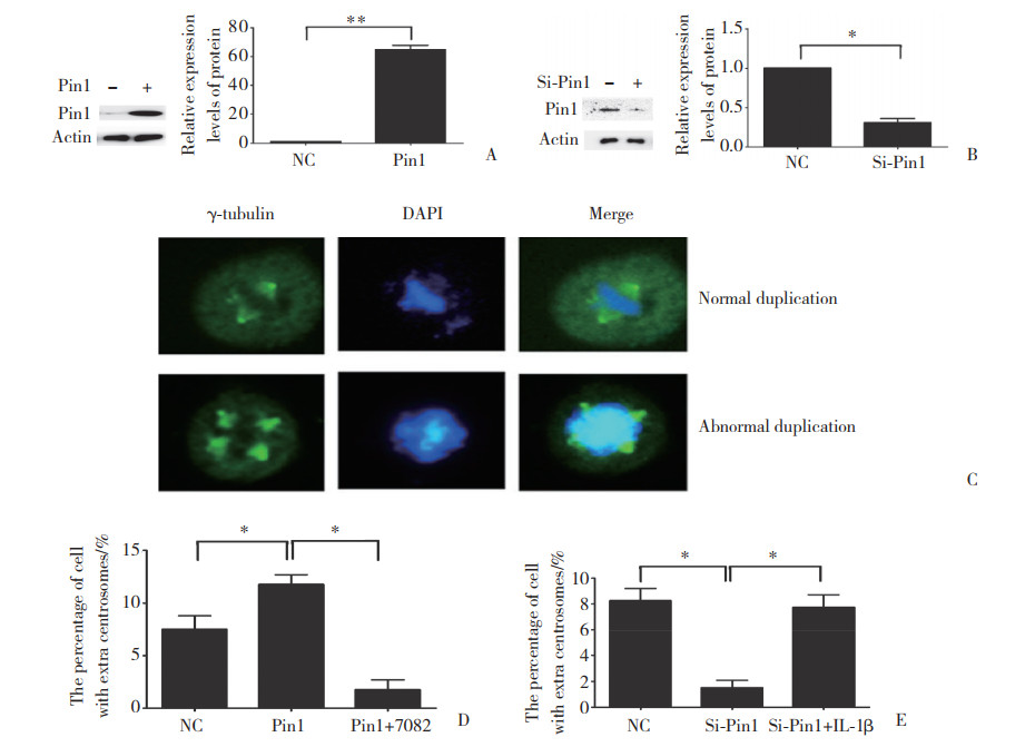 2 结果 2.1 Pin1经NF-κB/p65通路对细胞中心体异常扩增的影响在Hep-2细胞中分别转染pcDNA3.1-Pin1和siRNA来改变Pin1表达。结果显示,转染pcDNA3.1-Pin1能够使Pin1表达显著提高(图 1A),而转染siRNA能够有效降低Pin1表达(图 1B)。免疫荧光实验结果显示,中心体在Hep-2细胞中出现异常扩增(图 1C)。Pin1过表达中与NC组比较,Pin1组Hep-2细胞中心体异常扩增的细胞数目比例增加(P < 0.05),而BAY11-7082能够抑制Pin1过表达的上调作用(图 1D)。Pin1干扰中与NC组比较,Si-Pin1组中心体异常扩增的细胞比例显著降低(P < 0.05),IL-1β能够逆转此效应(图 1E)。提示Pin1能够通过NF-κB通路上调中心体异常扩增。