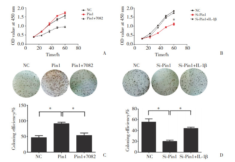 Hep-2细胞Pin1过表达中与NC组比较,Pin1组克隆形成数目显著增加,而BAY11-7082能够抑制Pin1过表达的上调作用(均P < 0.05,图 2C)。Hep-2细胞Pin1干扰中与NC组比较,Si-Pin1组克隆形成数目显著减少,IL-1β能够逆转这一效应(均P < 0.05,图 2D)。表明Pin1可通过NF-κB通路促进Hep-2细胞克隆形成。