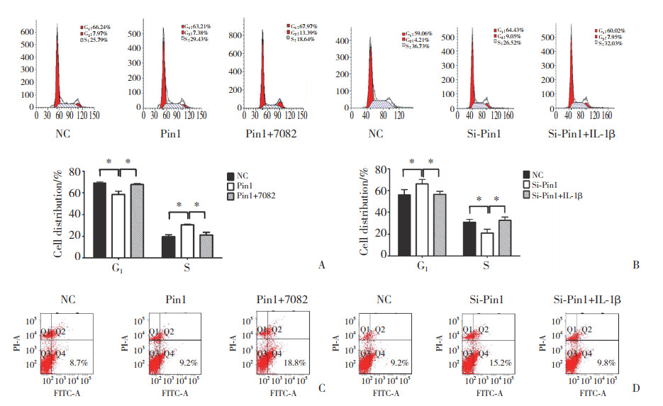 2.3 Pin1对细胞周期和凋亡的影响流式细胞仪检测细胞周期结果显示,Hep-2细胞Pin1过表达中与NC组比较,Pin1组G1期细胞减少,S期细胞增加,而BAY11-7082能够抑制Pin1过表达的调节作用(均P < 0.05,图 3A)。Pin1干扰中与NC组比较,Si-Pin1组G1期细胞增加,S期细胞减少,IL-1β能够逆转这一效应(均P < 0.05,图 3B)。提示Pin1能够通过NF-κB通路促进G1/S期的转化,而加入NF-κB/p65抑制可以消减G1/S期的转化作用,Pin1通过NF-κB通路对细胞周期产生影响。
