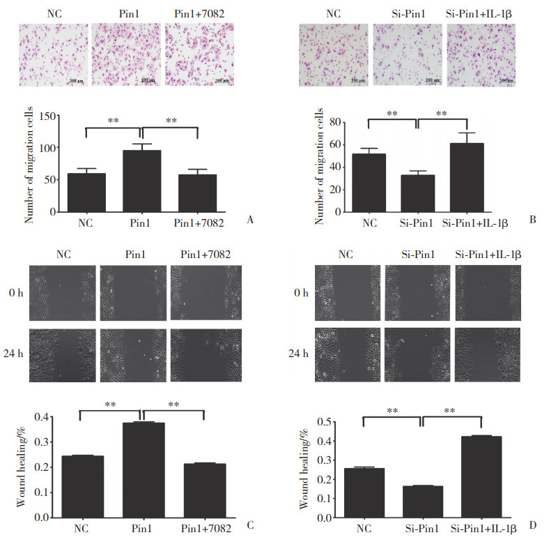 划痕实验结果显示,Hep-2细胞Pin1过表达中与NC组比较,Pin1组细胞迁移距离显著增加,而BAY11-7082能够抑制Pin1过表达的上调作用(均P < 0.01,图 4C)。Pin1干扰中与NC组比较,Si-Pin1组迁移距离显著减少,IL-1β能够逆转这一效应(均P < 0.01,图 4D)。说明Pin1可通过NF-κB通路促进Hep-2细胞迁移。