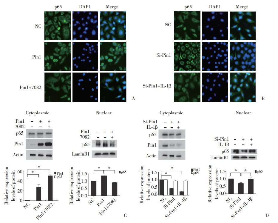 1.2.2 Pin1的siRNA构建、转染及分组Pin1的siRNA,靶序列5’-CATTTGAAGACGCCTCGTT-3’;正义链5’-CAUUUGAAGACGCCUCGUUdTdT-3’;反义链3’-dTdTGUAAACUUCUGCGGAGCAA-5’。细胞接种于6孔板中,在含10%小牛血清培养基中生长至60%~80%融合。采用脂质体转染法,按照脂质体说明书操作。Pin1过表达分为3组:转染pcDNA3.1组(NC组)、转染pcDNA3.1-Pin1组(Pin1组)、转染pcDNA3.1-Pin1后加NF-κB/p65抑制剂(BAY11-7082)组(Pin1+7082组)。Pin1干扰分为3组:转染阴性对照组(NC组)、转染siRNA组(Si-Pin1组)、转染siRNA后加NF-κB/p65激活剂(IL-1β)组(Si-Pin1+IL-1β组)。
