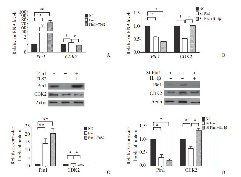 2.6 Pin1对CDK2表达的影响实时PCR检测结果显示,Hep-2细胞Pin1过表达中与NC组比较,Pin1组CDK2表达上调,而BAY11-7082能够抑制Pin1过表达的上调作用(均P < 0.05,图 6A)。Pin1干扰中与NC组比较,Si-Pin1组CDK2表达下调,IL-1β能够逆转这一效应(均P < 0.01,图 6B)。Western blotting蛋白检测结果与实时PCR检测结果一致,见图 6C、6D。提示Pin1促进NF-κB/p65核转位,上调CDK2的表达,可能通过NF-κB通路对CDK2表达产生影响。