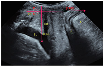 | PS, pubic syphilis; UR, urethra; BL, bladder; BLN, bladder neck; R, rectum; A, levator ani muscle. 图 1 首次妊娠组经盆底超声女性盆底矢状切面 Fig.1 sagittal section of the pelvic floor of a woman the first pregnancy group |