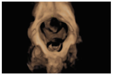 1.2.2.2 操作方法经阴道超声观察盆底结构,膀胱适度充盈,取截石位,充分暴露会阴部,将耦合剂涂抹于探头表面,用探头套包裹探头,将探头轻置于会阴部;显示盆底矢状切面图像,见图 1。观察耻骨联合(pubic syphilis,PS)、尿道(urethra,UR)、膀胱(bladder,BL)和膀胱颈(bladder neck,BLN)。在二维测量2组孕妇膀胱颈位置(D)、尿道倾斜角(β)、膀胱尿道后角(poster urethrovesical angle,PUVA),分别测量静息及张力状态下膀胱颈位置(D1、D2)、尿道倾斜角(β1、β2)、膀胱尿道后角(PUVA1、PUVA2),并计算膀胱颈移动度(bladder neck descent,BND)、尿道旋转角度(urethra rotation angle,URA)。在静息及张力状态下启动三维成像,获取肛提肌裂孔面积(levator hiatus area,LHA),见图 2,测量2组孕妇不同状态下LHA(LHA1和LHA2)。