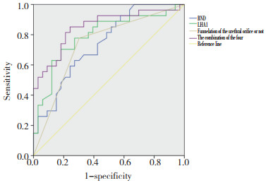 | 图 4 BND、LHA1、尿道内口漏斗化及四者联合诊断SUI的ROC曲线图 Fig.4 The ROC curve of BND, LHA1, funnelation of the urethral orifice and four joint in diagnosing SUI |